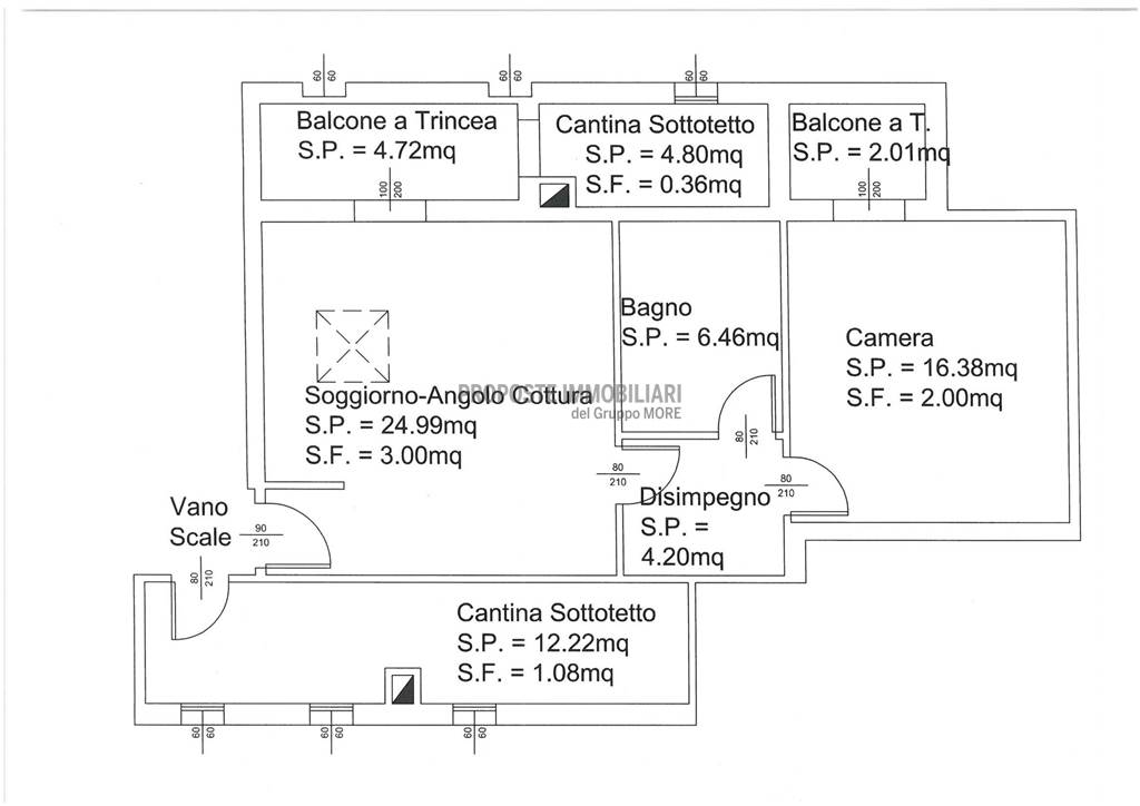 Ingresso in zona giorno con angolo cottura e accesso a balcone a "trincea", comodo bagno, ampia camera matrimoniale con balcone a trincea; l'appartamento è dotato di due comode cantine sottotetto utilizzabili come ampi ripostigli.