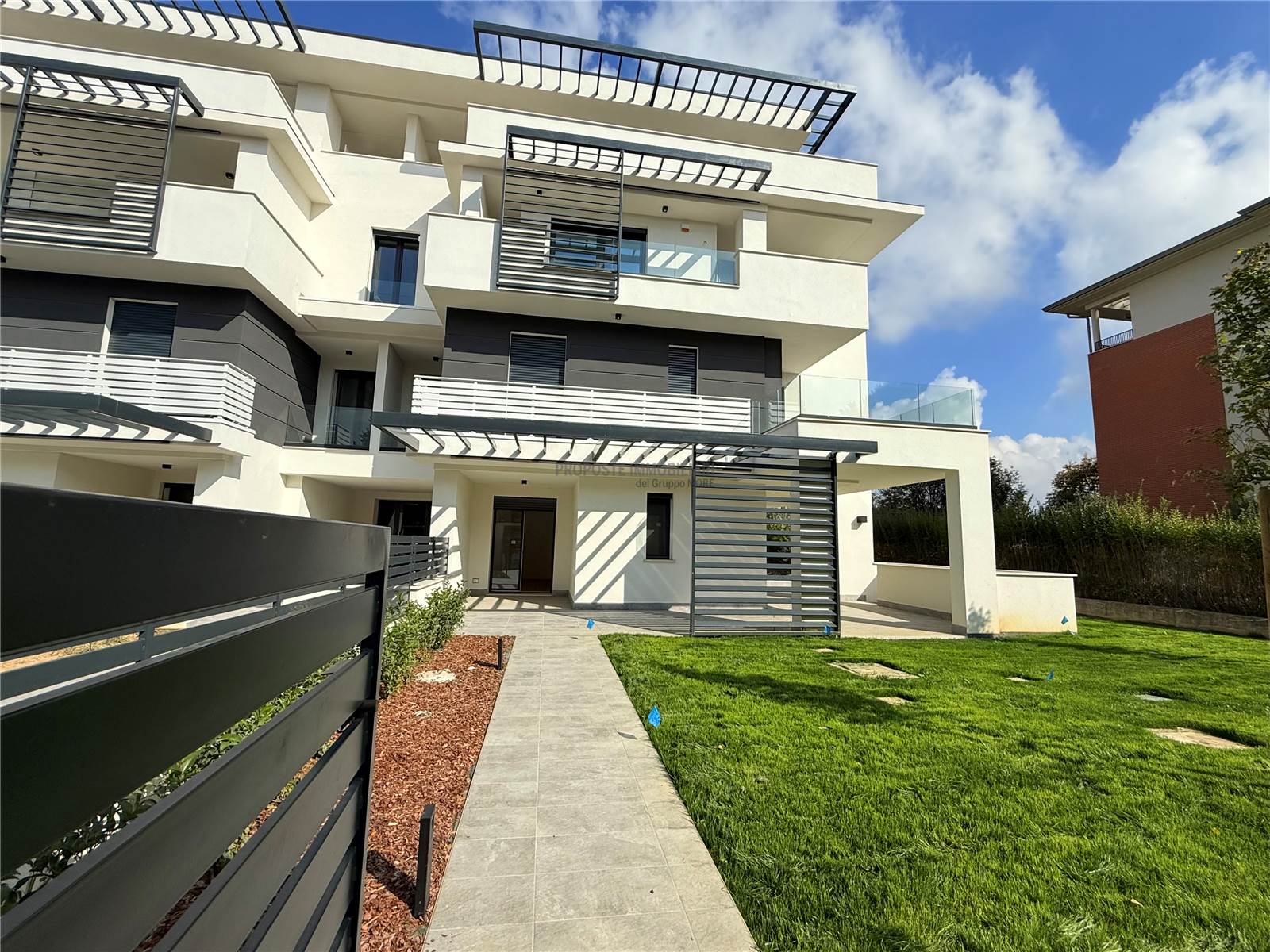 Appartamento così disposto: PT: ingresso, soggiorno e bagno; giardino di pertinenza e scala privata che porta all'autorimessa al piano interrato. P1°: 3 camere da letto dotate di terrazzo e bagno.