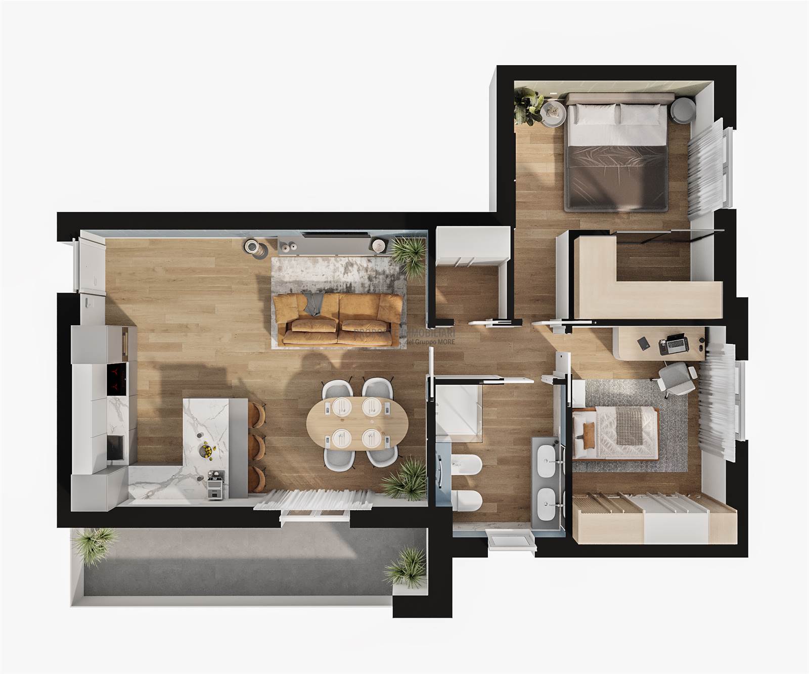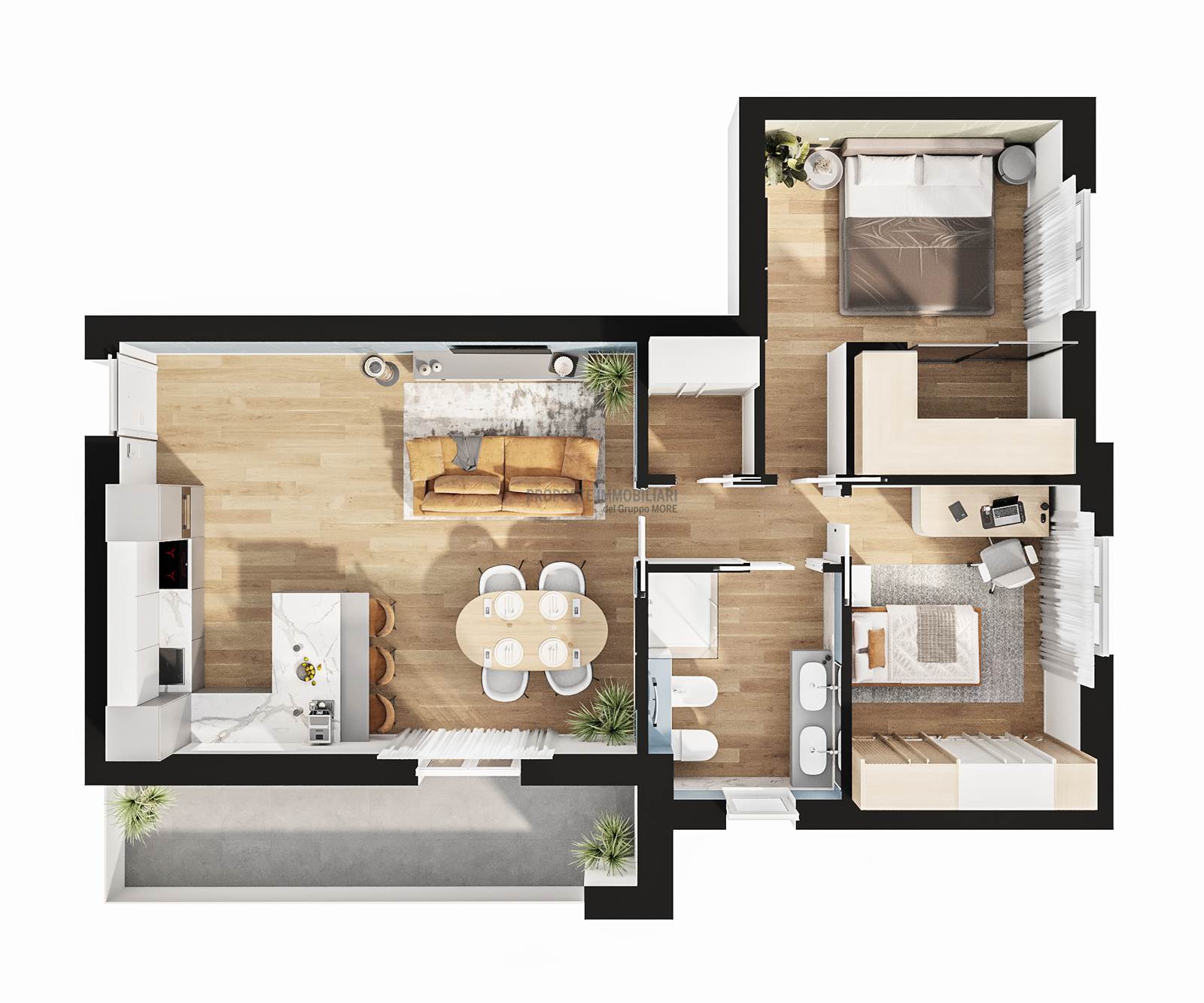 SOLUZIONE B1: appartamento al primo piano composto da sala con cucina a vista e affaccio su balcone, camera matrimoniale, camera singola, bagno, ripostiglio-lavanderia, autorimessa e posto auto coperto.