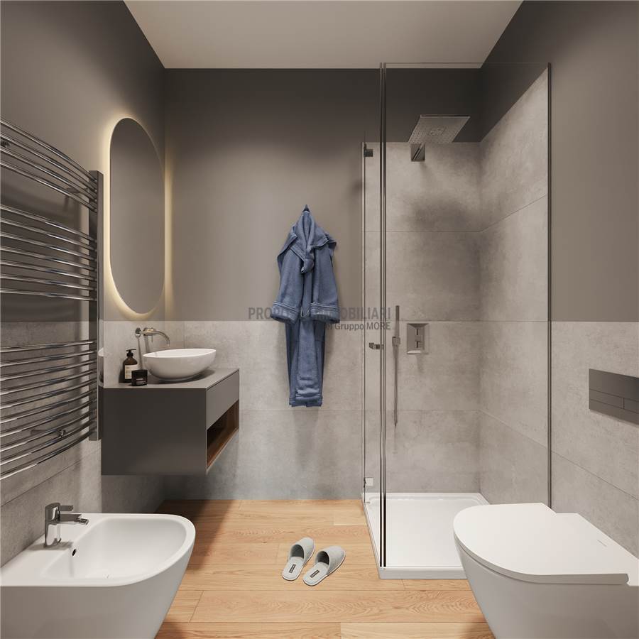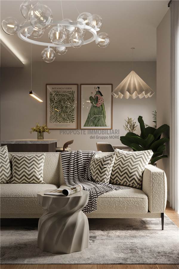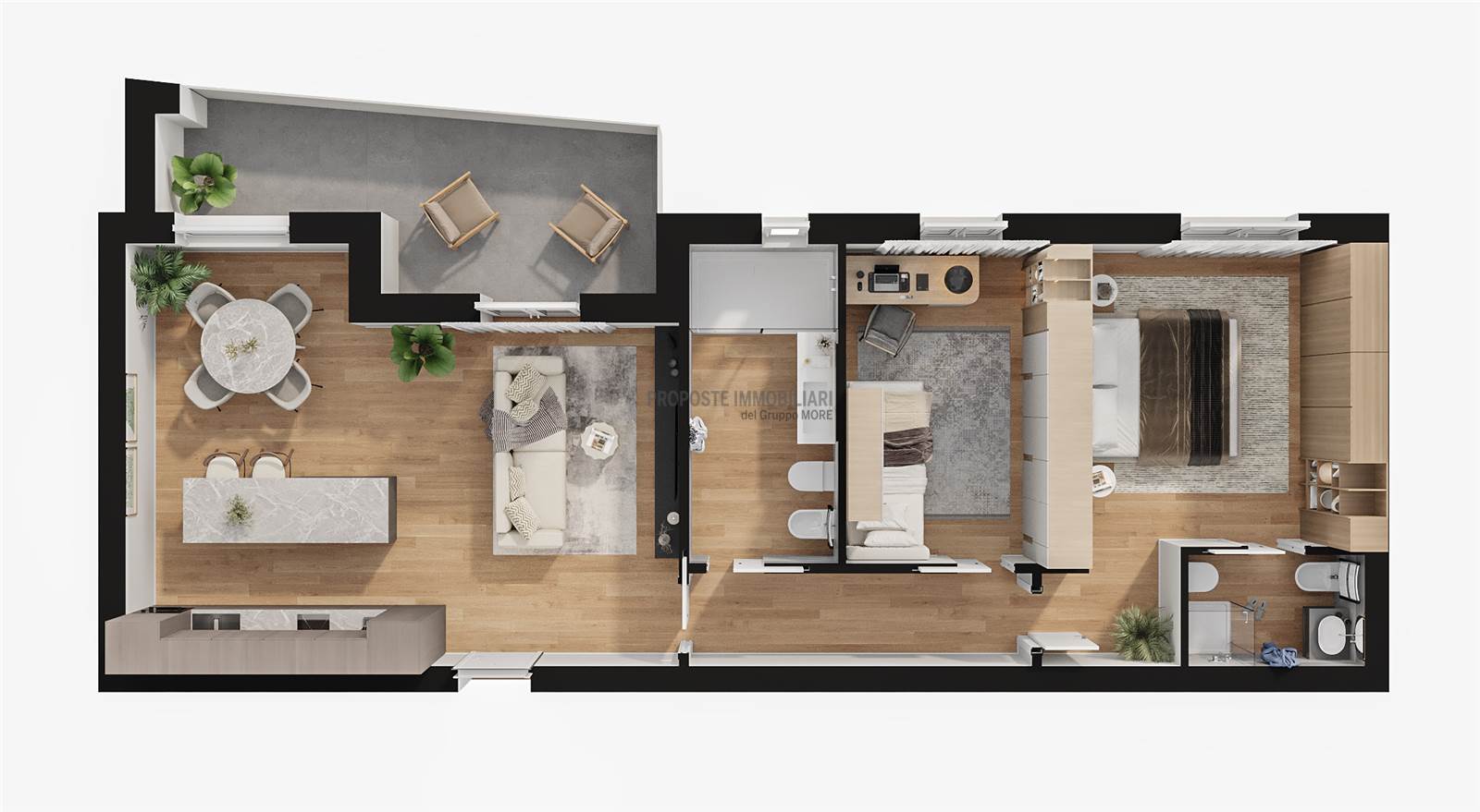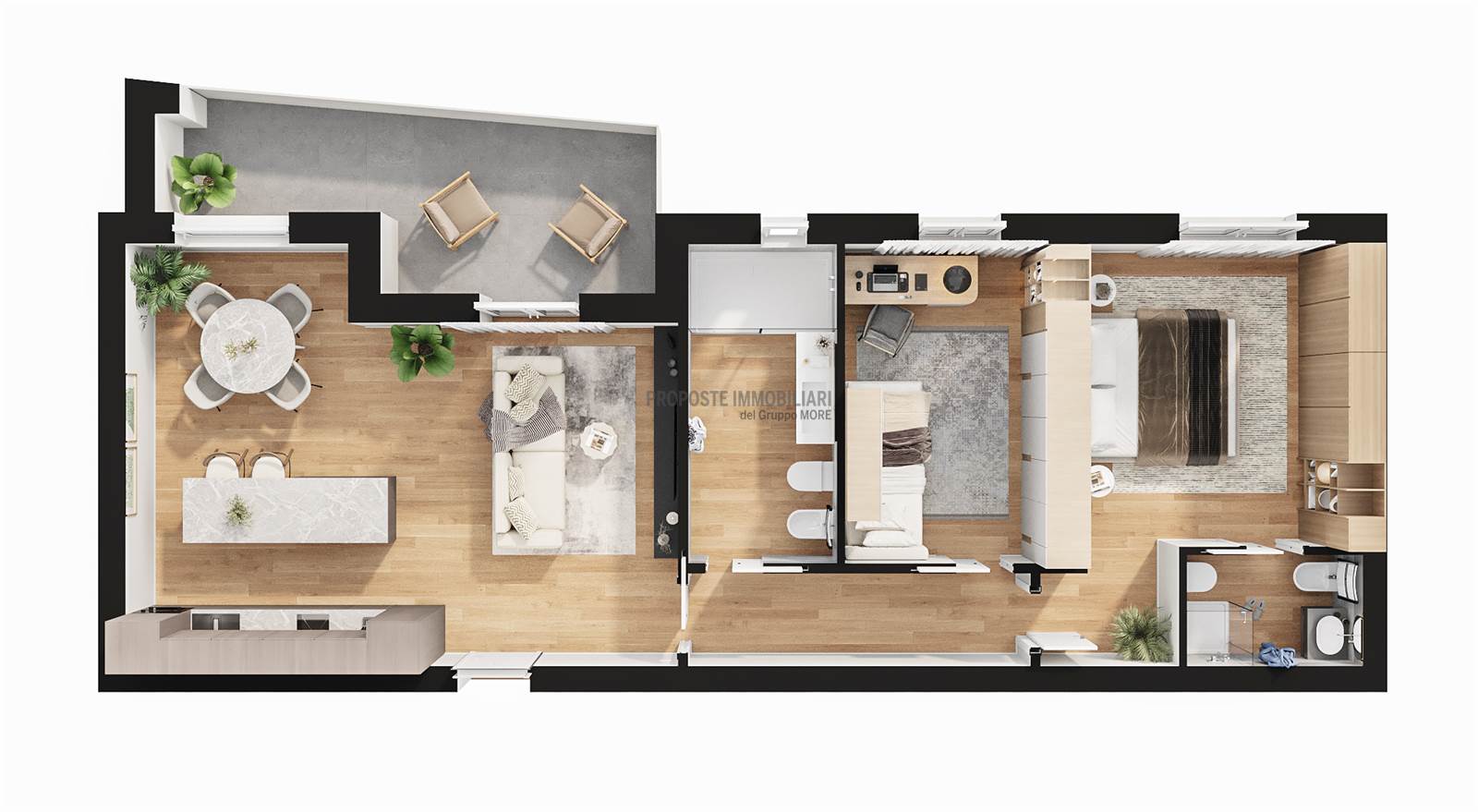 SOLUZIONE B2: appartamento al primo piano composto da sala con cucina a vista e affaccio su balcone loggiato, camera matrimoniale, camera singola, 2 bagni, autorimessa e posto auto coperto.