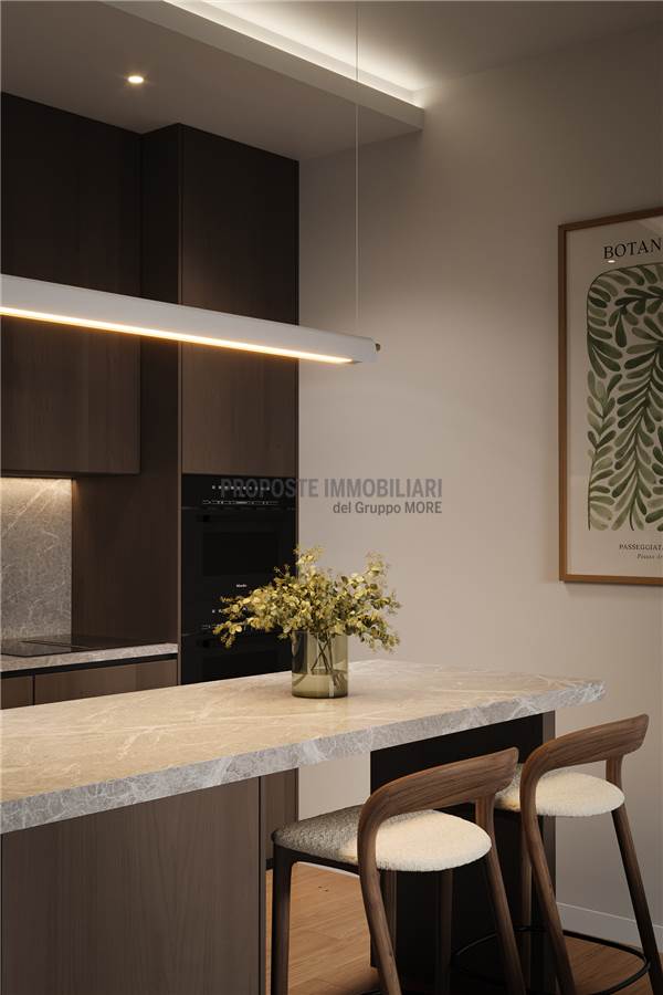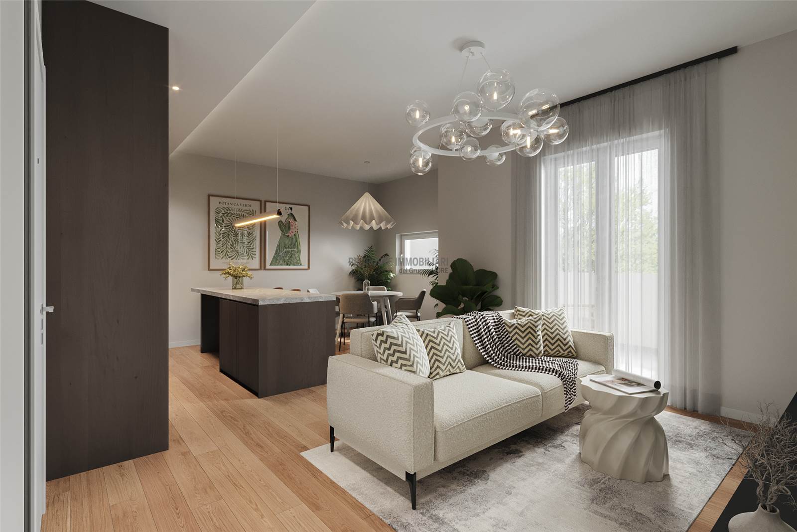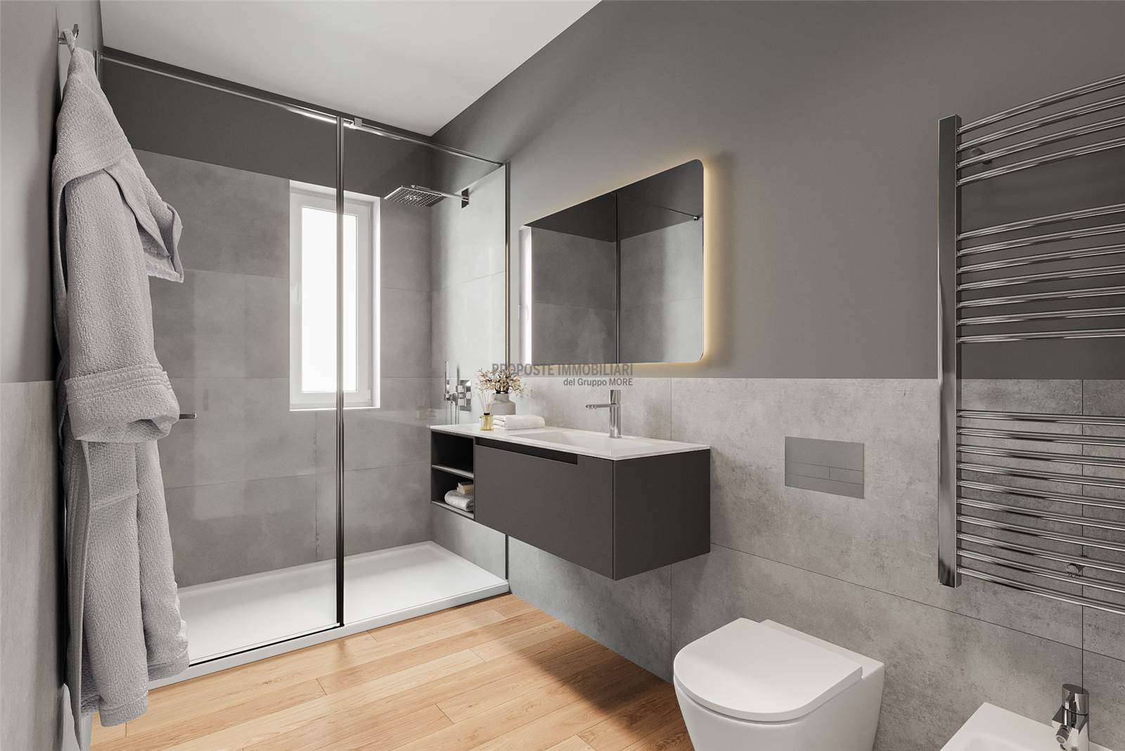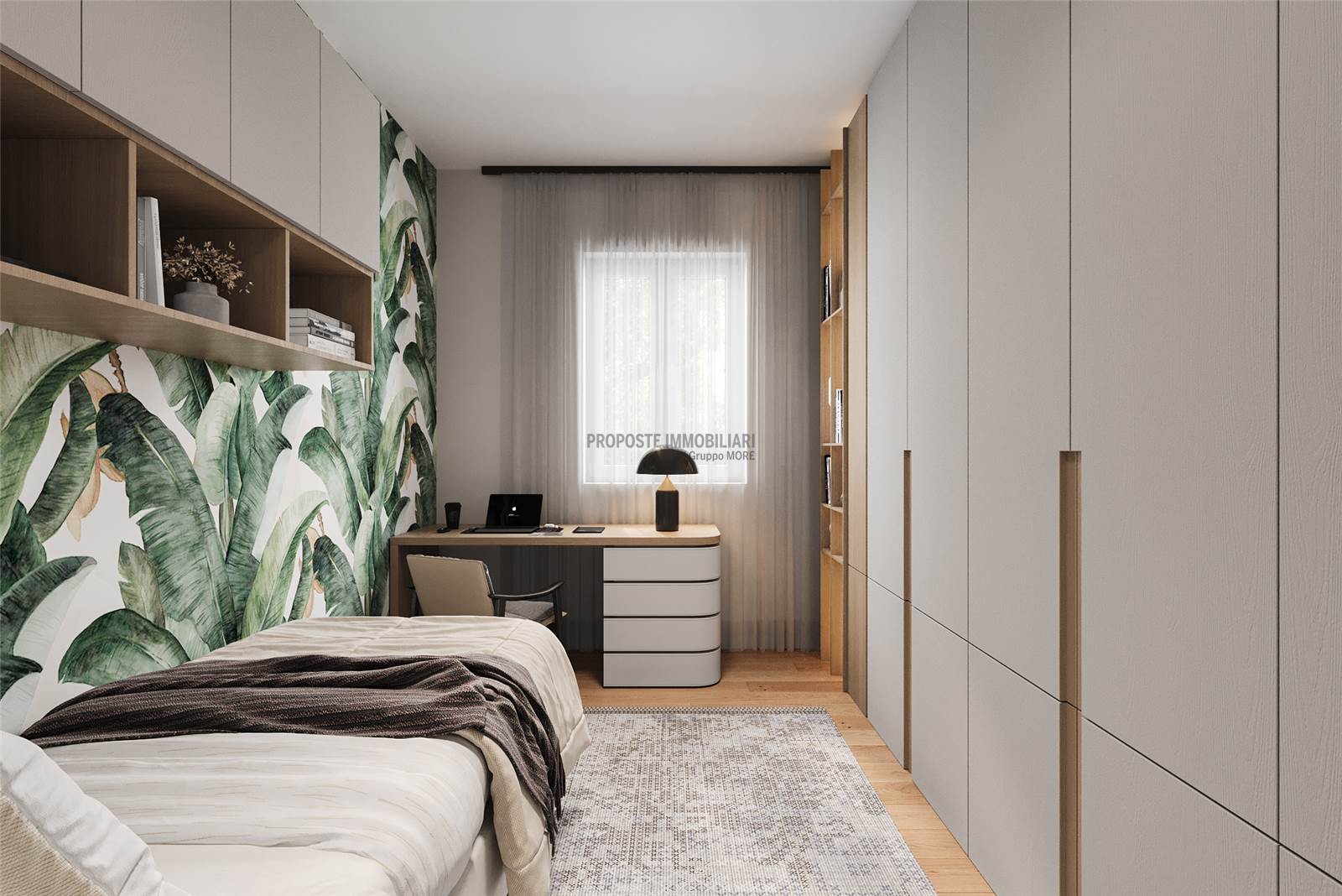SOLUZIONE B2: appartamento al primo piano composto da sala con cucina a vista e affaccio su balcone loggiato, camera matrimoniale, camera singola, 2 bagni, autorimessa e posto auto coperto.