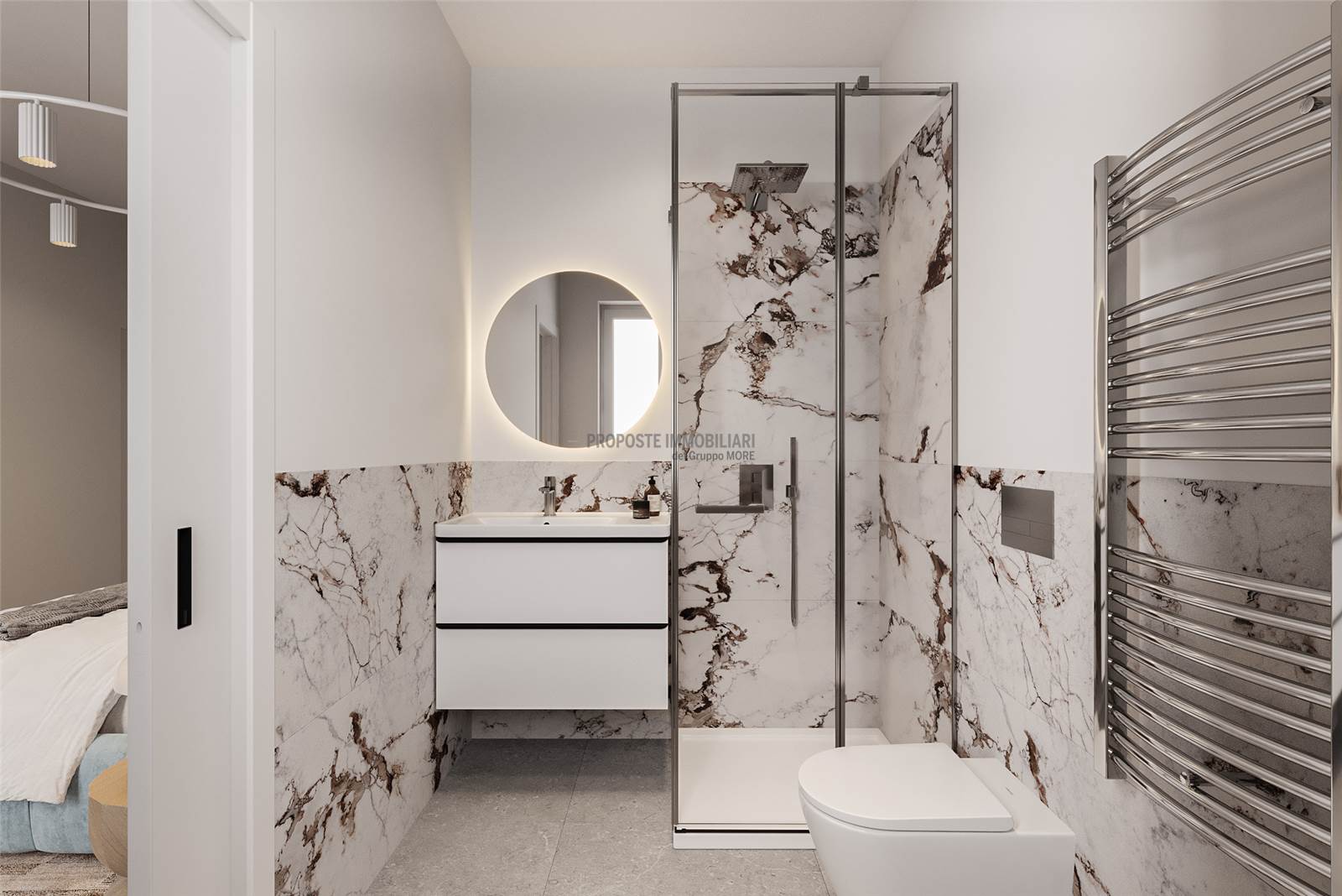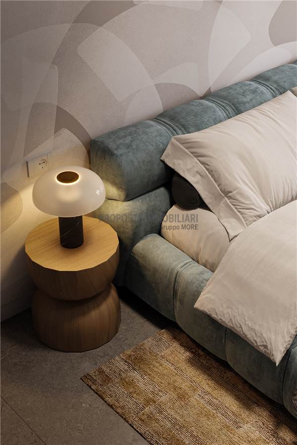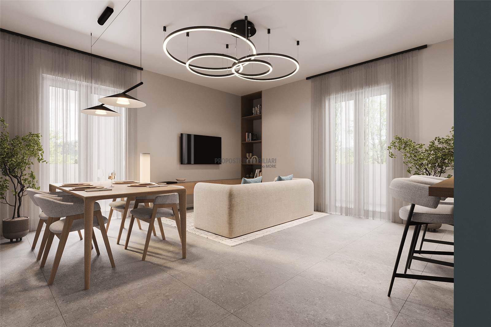 SOLUZIONE B4: appartamento al secondo piano composto da sala con cucina a vista e affaccio su balcone e ampia terrazza, camera matrimoniale, camera singola, 2 bagni, autorimessa e posto auto coperto.