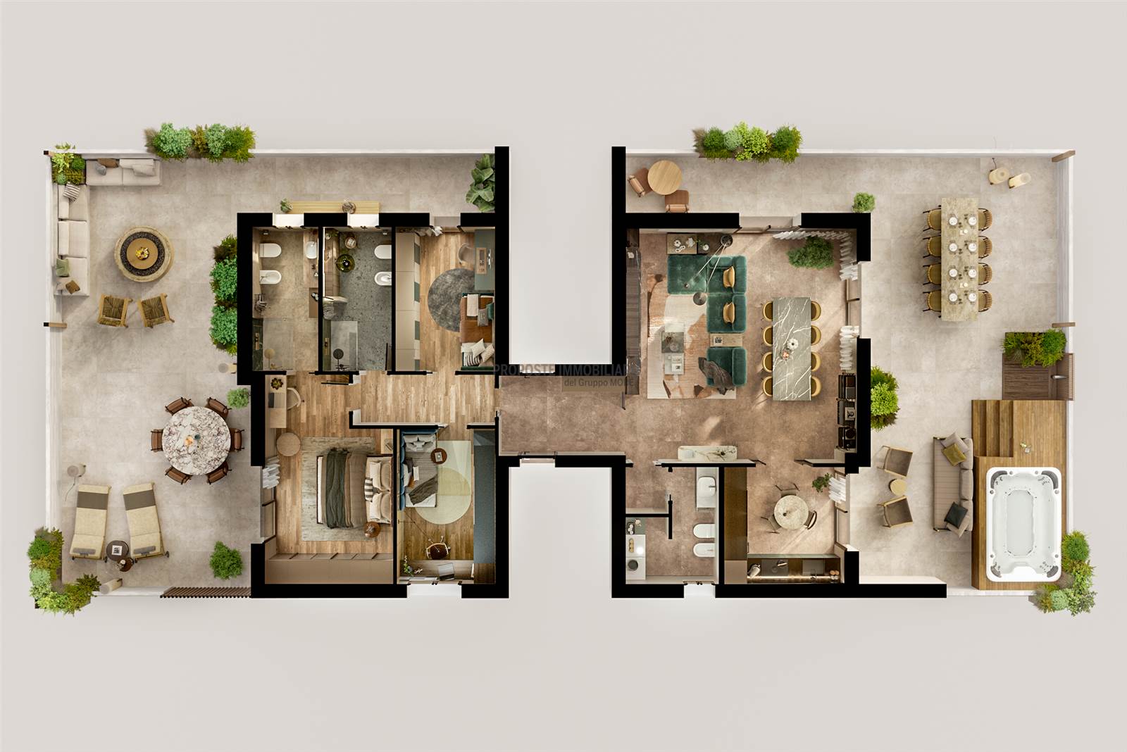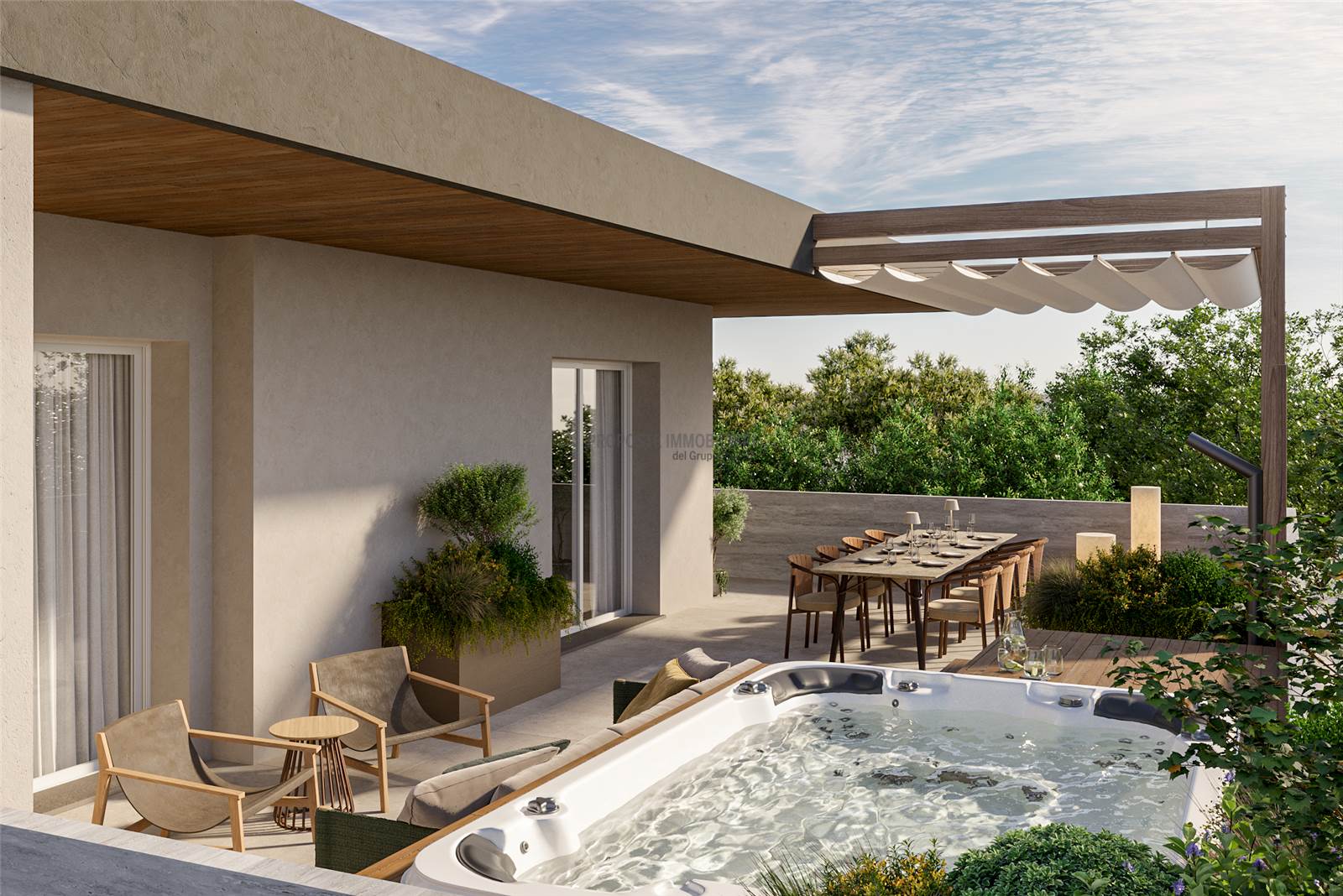 Ogni edificio è composto da 2 maisonettes con giardino e piscina privata, due appartamenti e un attico.