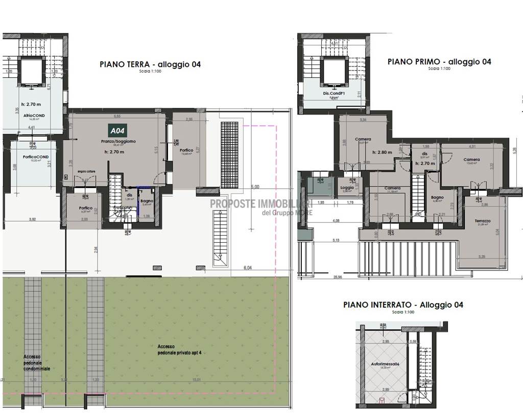 Appartamento così disposto: PT: ingresso, soggiorno e bagno; giardino di pertinenza e scala privata che porta all'autorimessa al piano interrato. P1°: 3 camere da letto dotate di terrazzo e bagno.