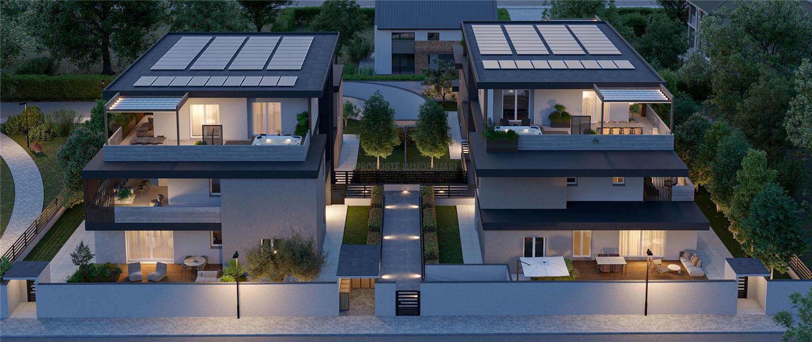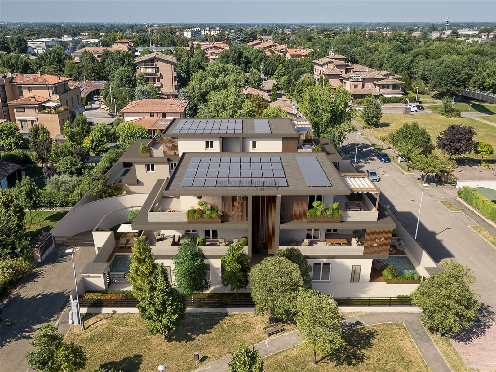 Ogni edificio è composto da 2 maisonettes con giardino e piscina privata, due appartamenti e un attico.