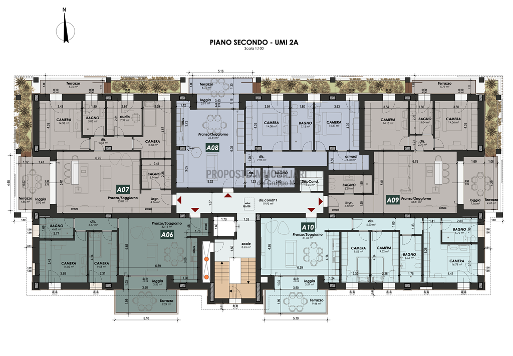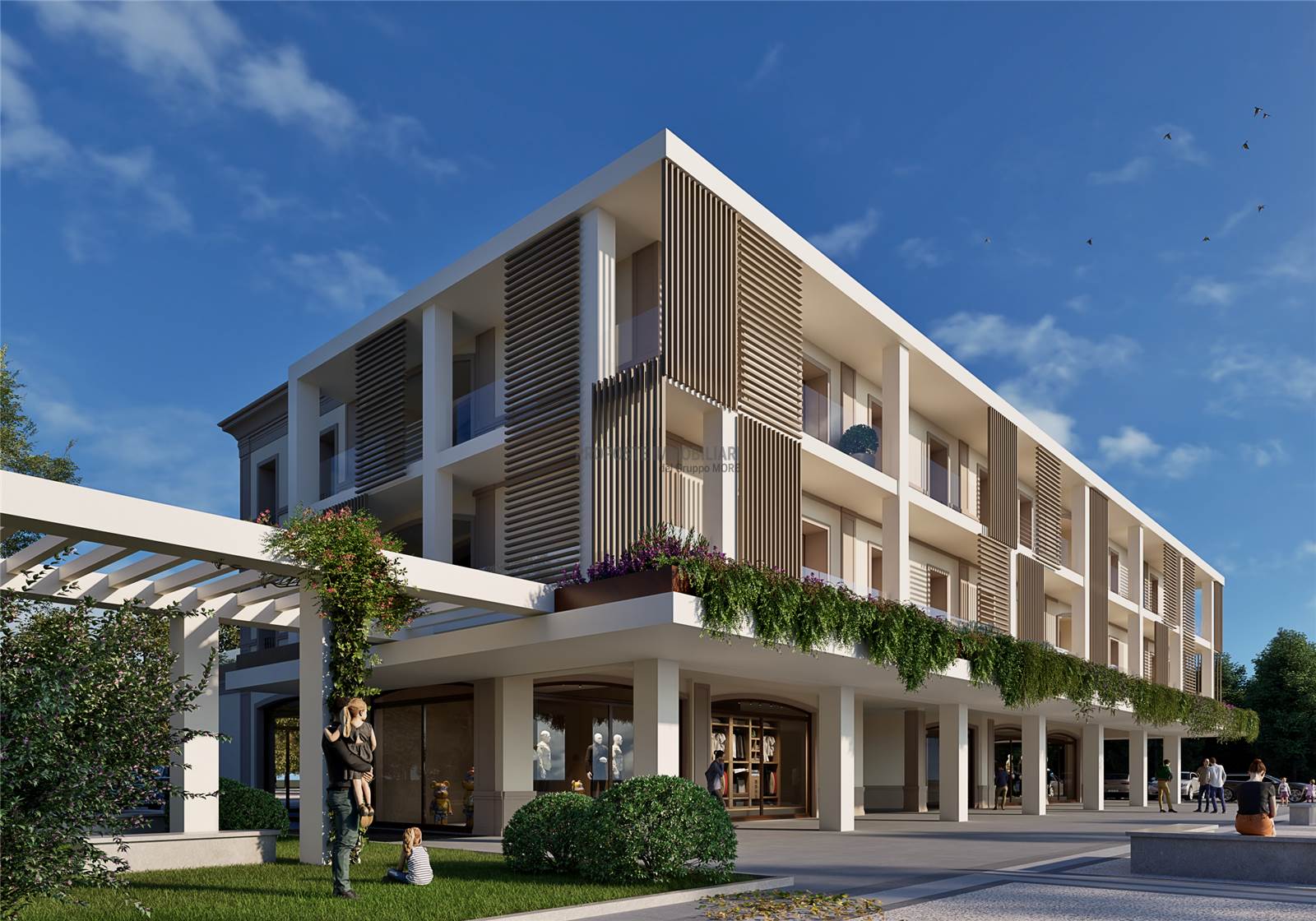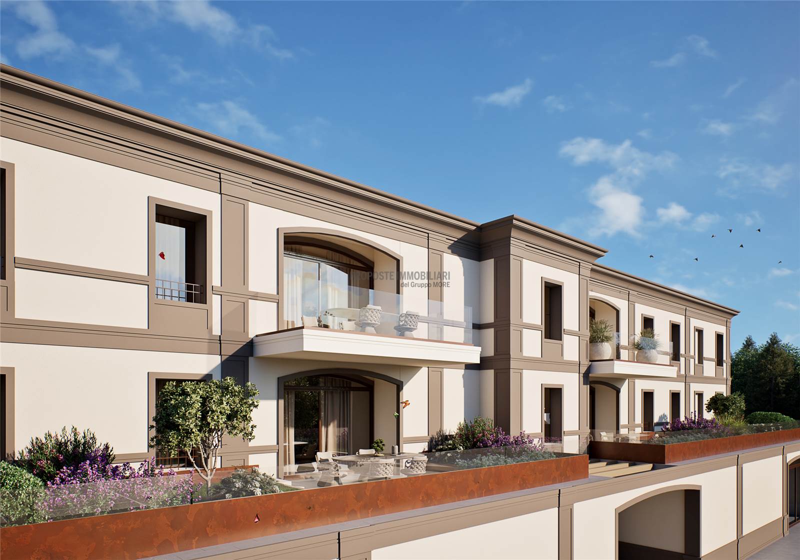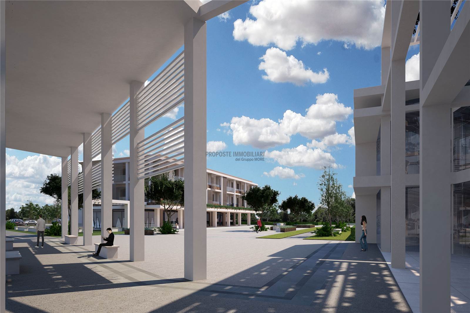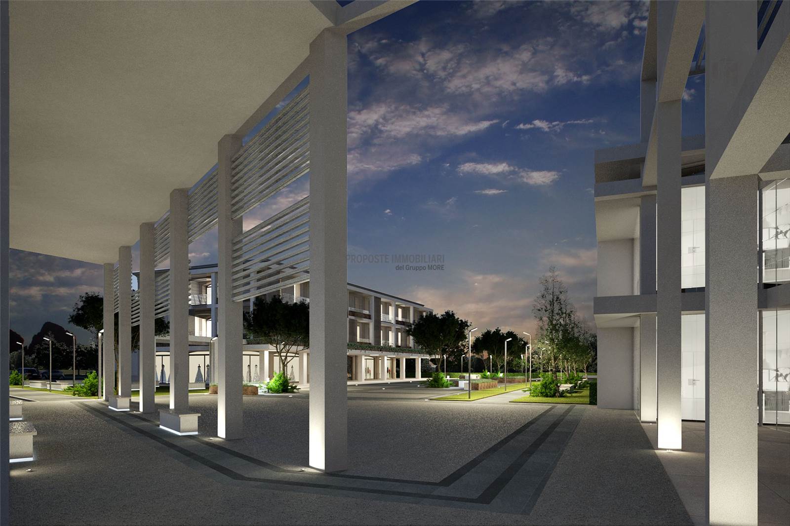 App.to così disposto: ingresso, soggiorno con sbocco sul terrazzo e giardino pensile, cucina a vista, bagno cieco, dis. notte, due camere da letto, uno studio, bagno finestrato e secondo terrazzo con giardino pensile.