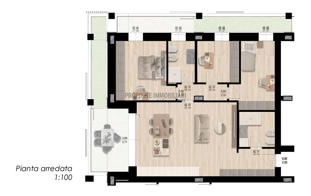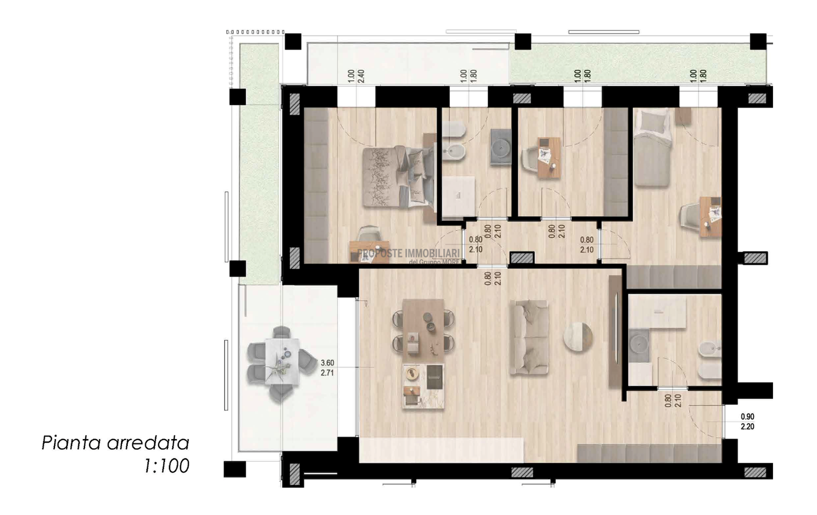 App.to così disposto: ingresso, soggiorno con sbocco sul terrazzo e giardino pensile, cucina a vista, bagno cieco, dis. notte, due camere da letto, uno studio, bagno finestrato e secondo terrazzo con giardino pensile.