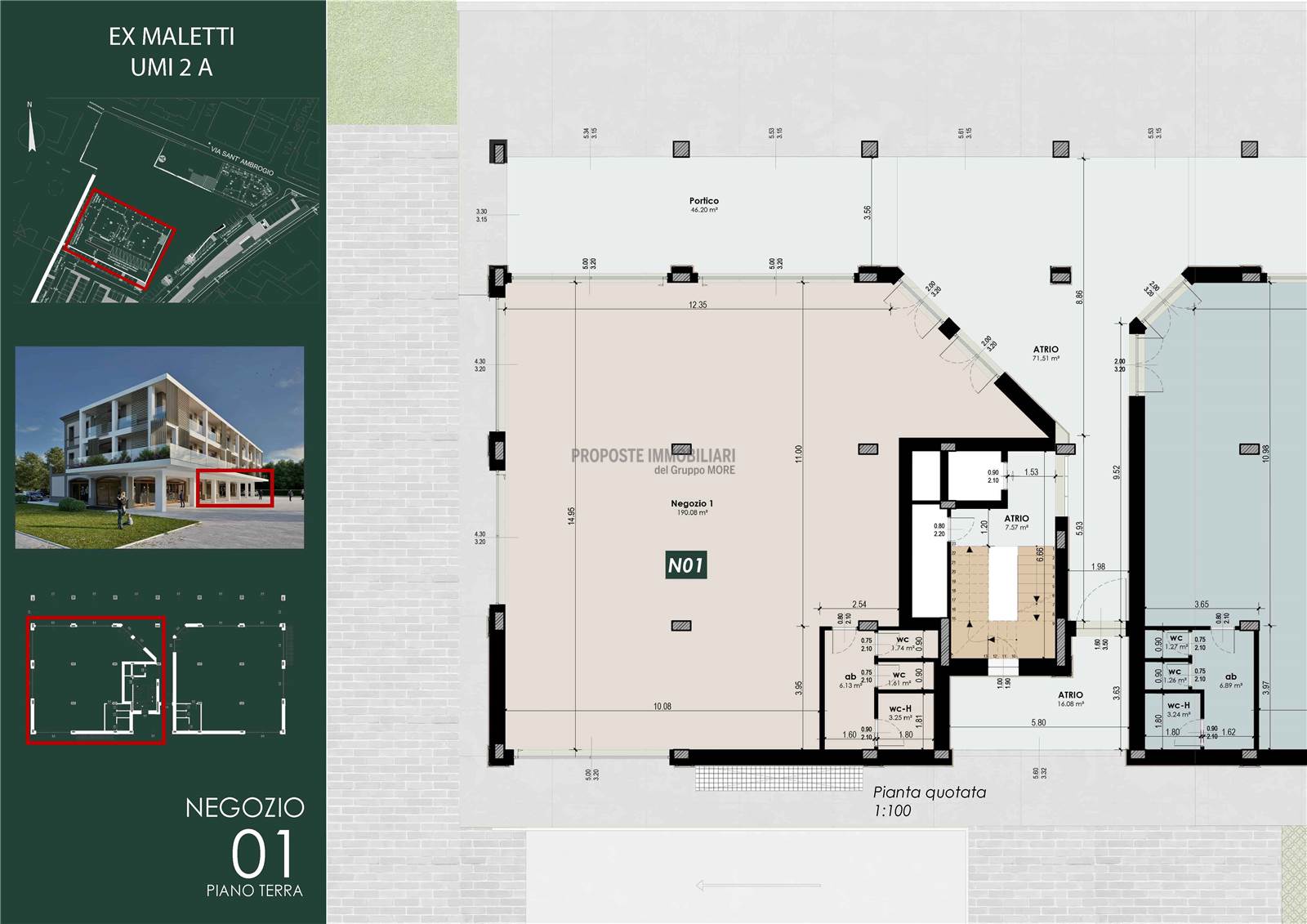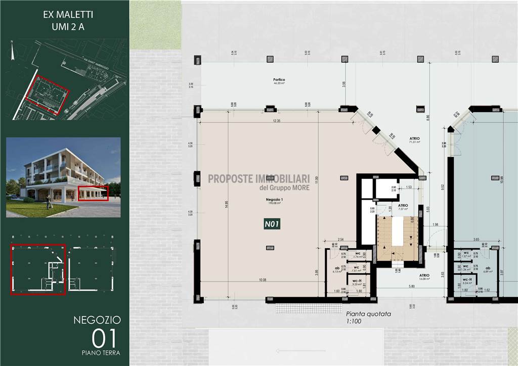 MO860D-UMI2A(N01). Nostra esclusiva, Casinalbo, Borgo San Luigi - Ex Salumificio Maletti, in angolo verde comodo a tutti i servizi prossima realizzazione di comparto residenziale (Classe Energetica A4 - NZEB) composto da nr. 9 palazzine e due ville indipendenti. Al piano terra della palazzina UMI2A vendesi negozio "N01" di 235 mq. con ampie vetrate e affaccio su piazza.