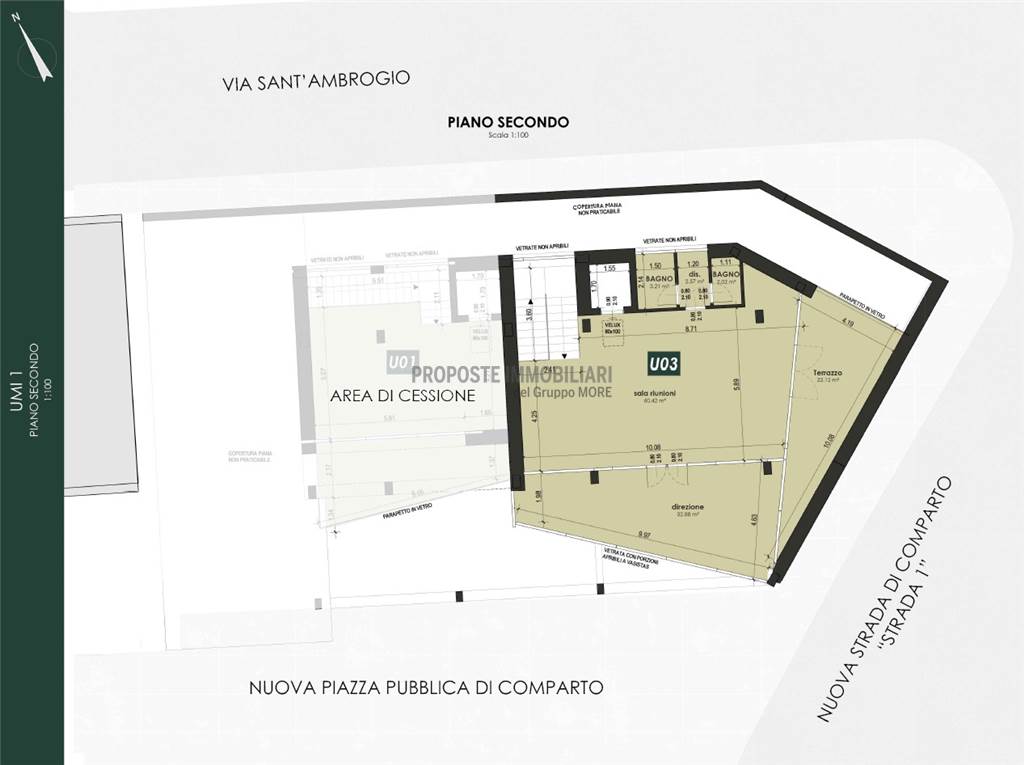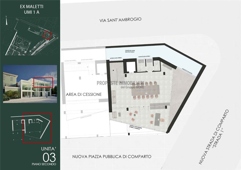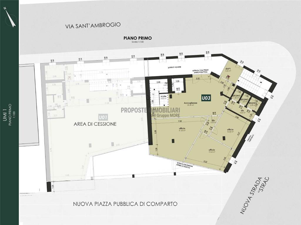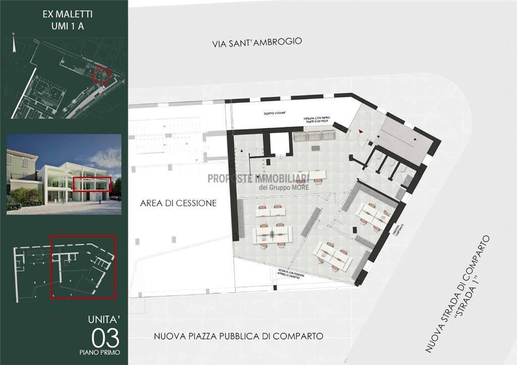 Al primo piano della palazzina UMI1A vendesi ufficio "U3" di 298 mq. su due livelli (piani 1° e 2°) dotato di ingresso indipendente e ampie vetrate.