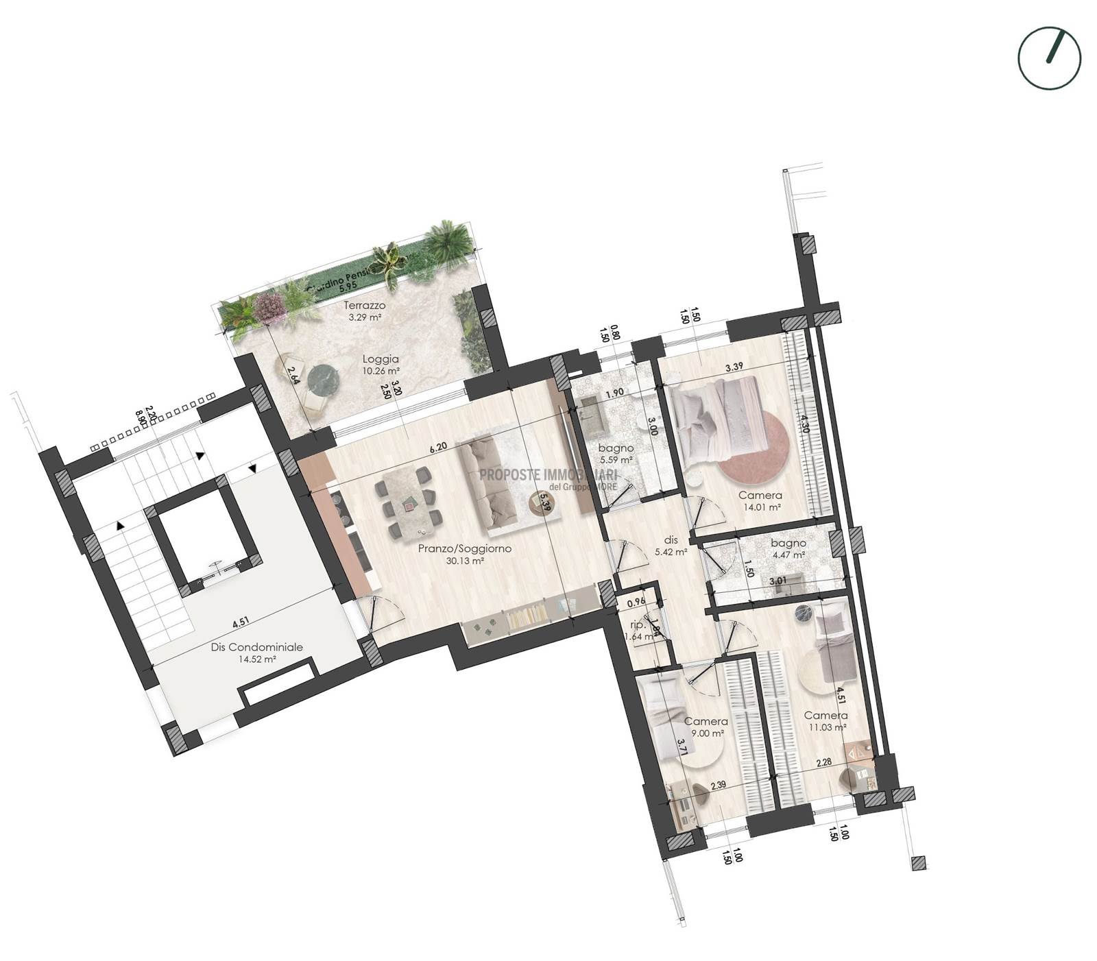 Appartamento così disposto: soggiorno/pranzo con cucina a vista, loggia coperta, giardino pensile, disimpegno, 3 camere da letto, due bagni (di cui uno cieco) e ripostiglio.
