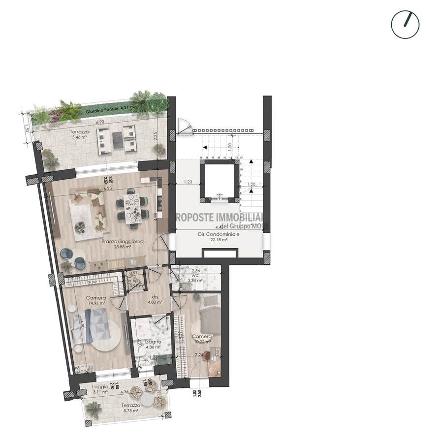 Appartamento così disposto: soggiorno/pranzo con cucina a vista, loggia coperta, giardino pensile, disimpegno, 2 camere da letto, due bagni (di cui uno cieco) e ripostiglio.