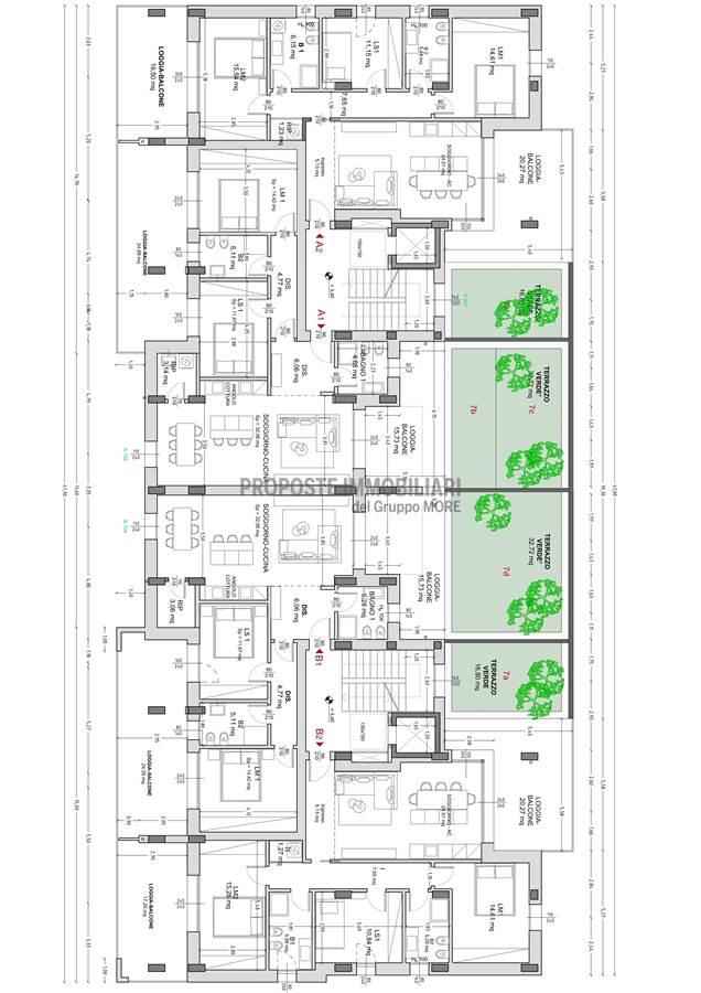 App.to così disposto: ingresso, soggiorno con cucina a vista e ampia loggia coperta, dis. notte, tre camere da letto matrimoniali (una dotata di seconda loggia) una camera singola, ripostiglio e due bagni (uno cieco).