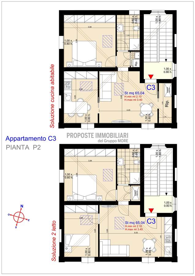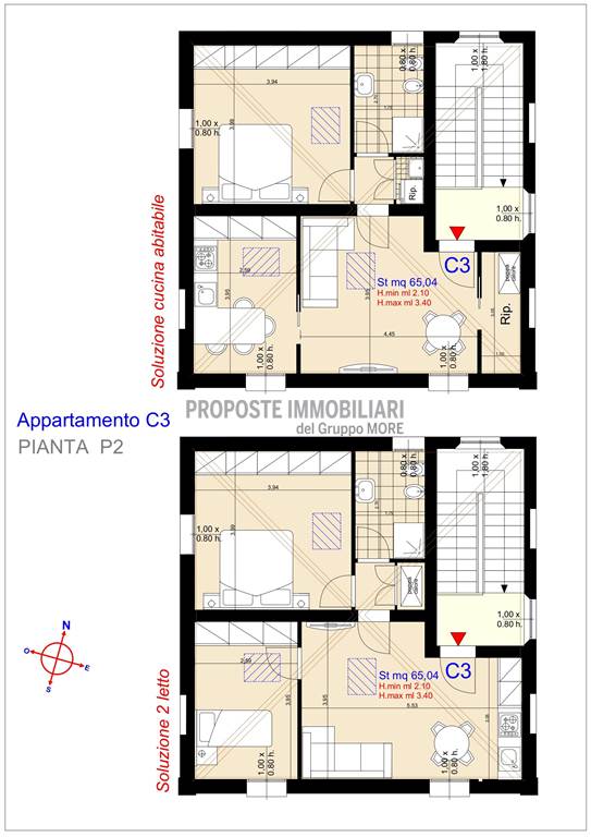 Immobile mansardato con travi a vista (altezza minima 2.10 mt) così disposto: ingresso, soggiorno con cucina a vista, camera singola, dis., camera matrimoniale e bagno.