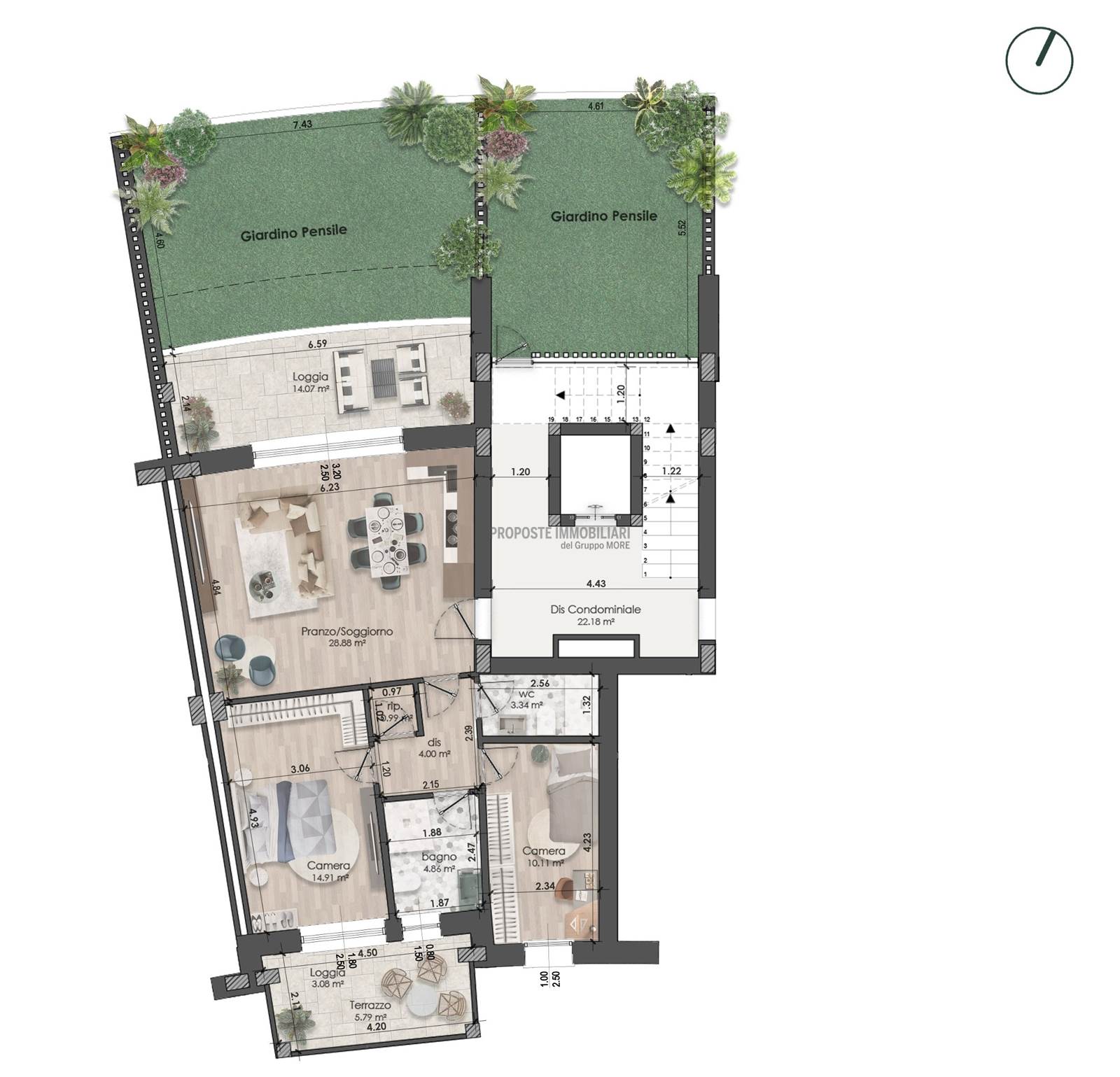 Appartamento così disposto: soggiorno/pranzo con cucina a vista, loggia coperta, giardino pensile, disimpegno, 2 camere da letto (di cui una dotata di seconda loggia coperta), due bagni (di cui uno cieco) e ripostiglio.