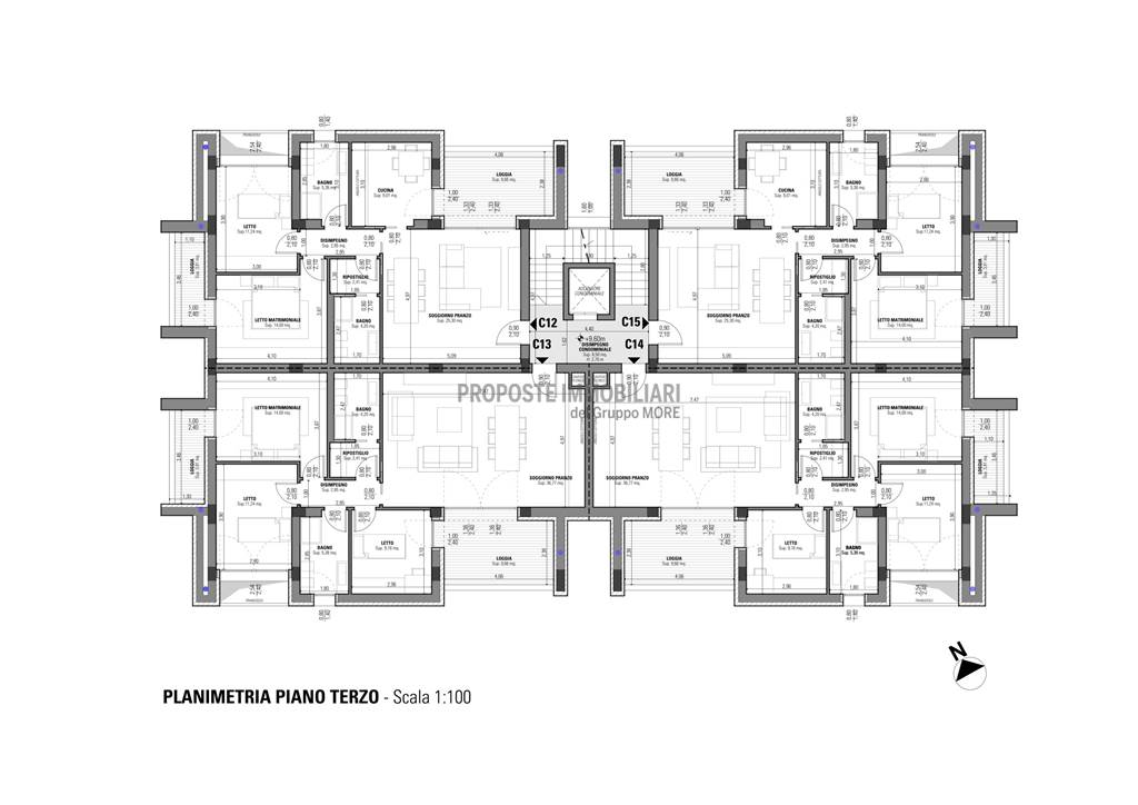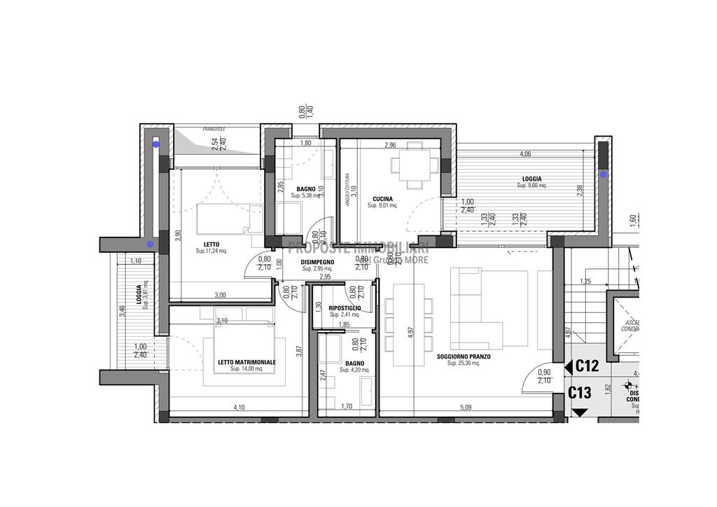 Appartamento così disposto: soggiorno/pranzo, loggia, cucina, disimpegno, due camere da letto (di cui una dotata di loggia), due bagni e ripostiglio.