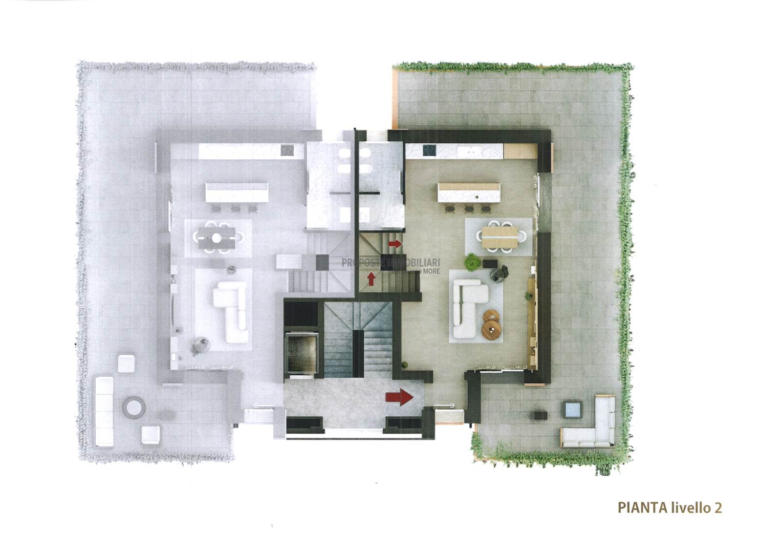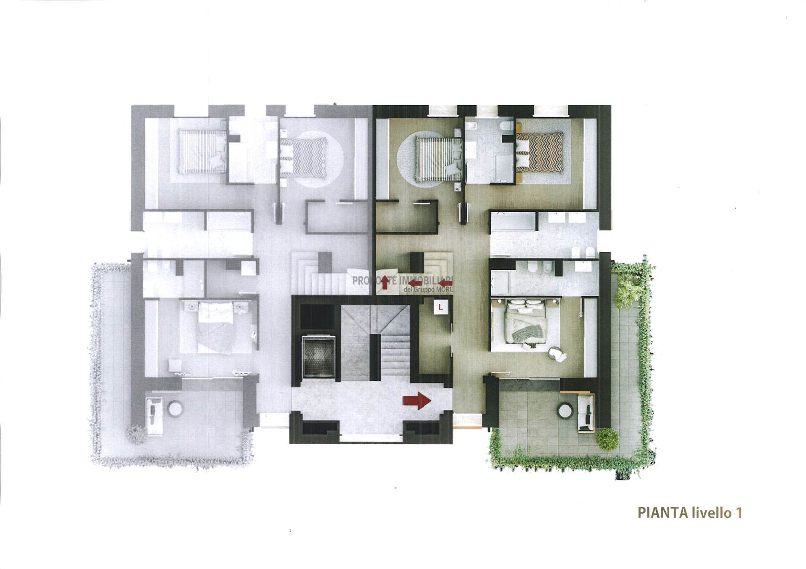 L’ UNITA' D, si sviluppa su due livelli, nel PIANO TERZO abbiamo tre camere matrimoniali, di cui una con bagno privato e loggia, una con bagno privato e una stanza armadi, altro bagno ed un ripostiglio; al PIANO QUARTO salone con grande loggia perimetrale, una cucina abitabile di ampia metratura, un bagno con antibagno.