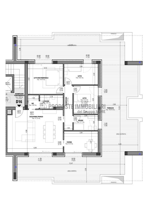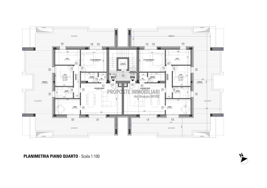 Appartamento così disposto: soggiorno/pranzo, cucina, disimpegno, tre camere da letto (con affaccio su terrazzo), due bagni, ripostiglio e ampio terrazzo perimetrale.