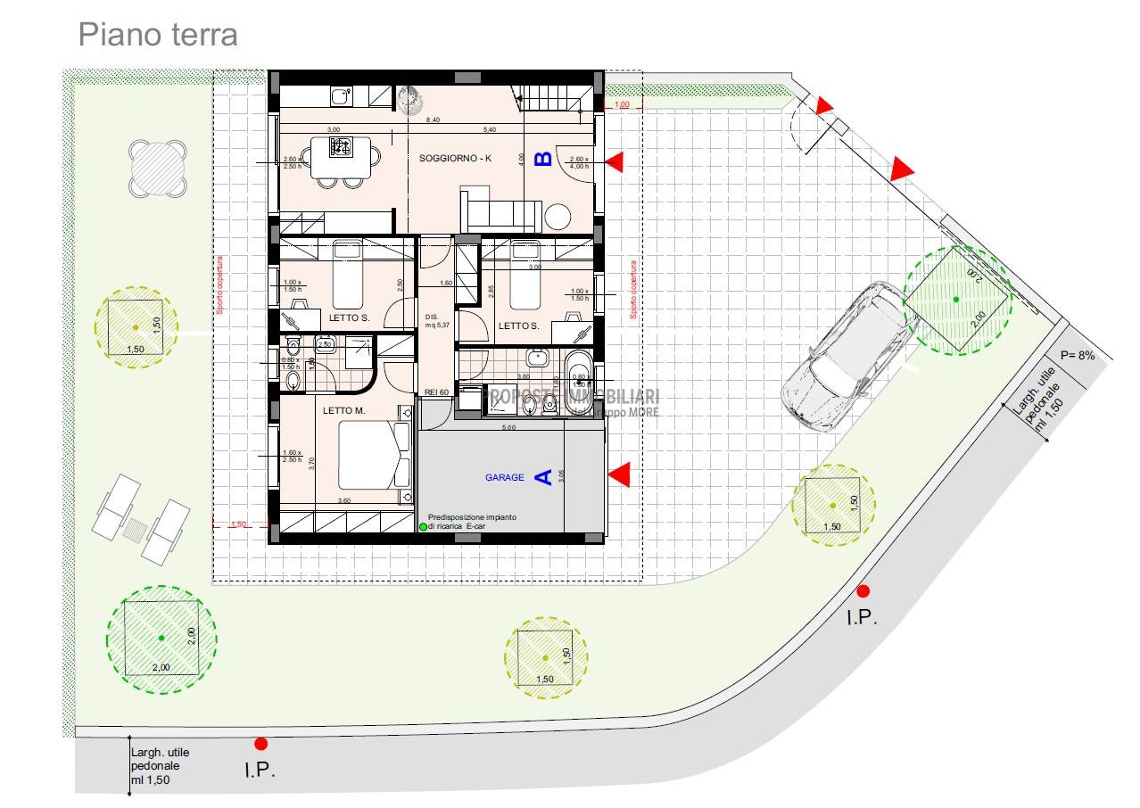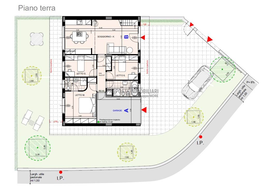 Immobile così disposto: ingresso indipendente, soggiorno con cucina a vista e doppio sbocco su giardino privato fronte/retro, disimpegno notte, tre camere da letto, due bagni finestrati e angolo lavanderia. A completamento della proprietà un garage, un posto auto e giardino privato di 262 mq.