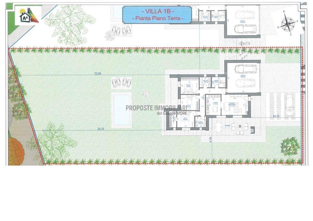 Piano Terra: ingresso su soggiorno, cucina abitabile, due bagni, disimpegno, tre camere (due camere matrimoniali e una camera singola) di cui una con cabina armadi, ripostiglio/lavanderia. Garage doppio. Classe A4. Consegna 2027.