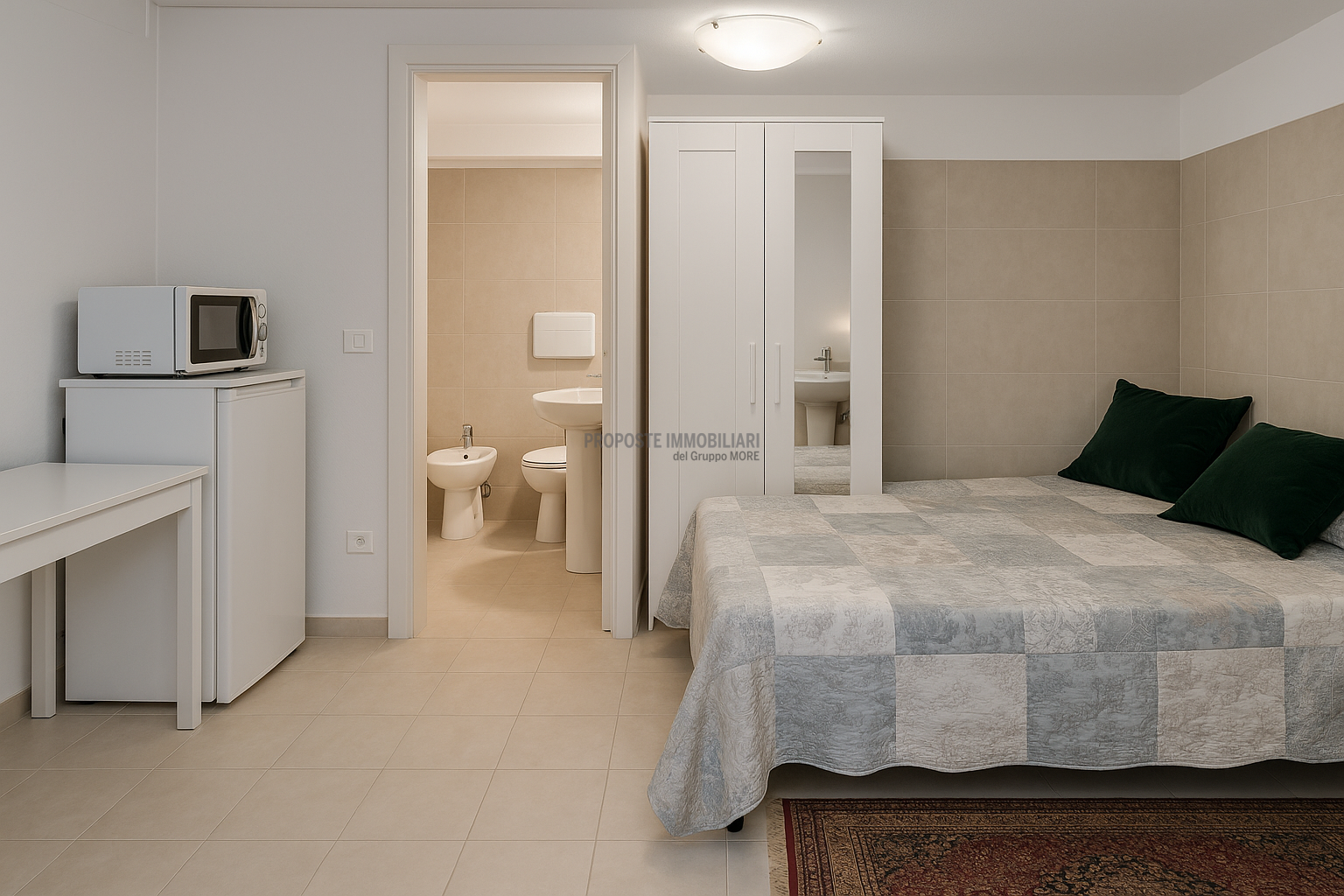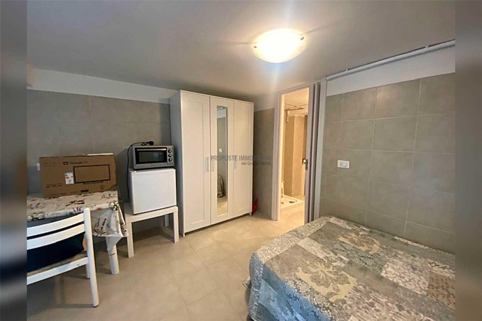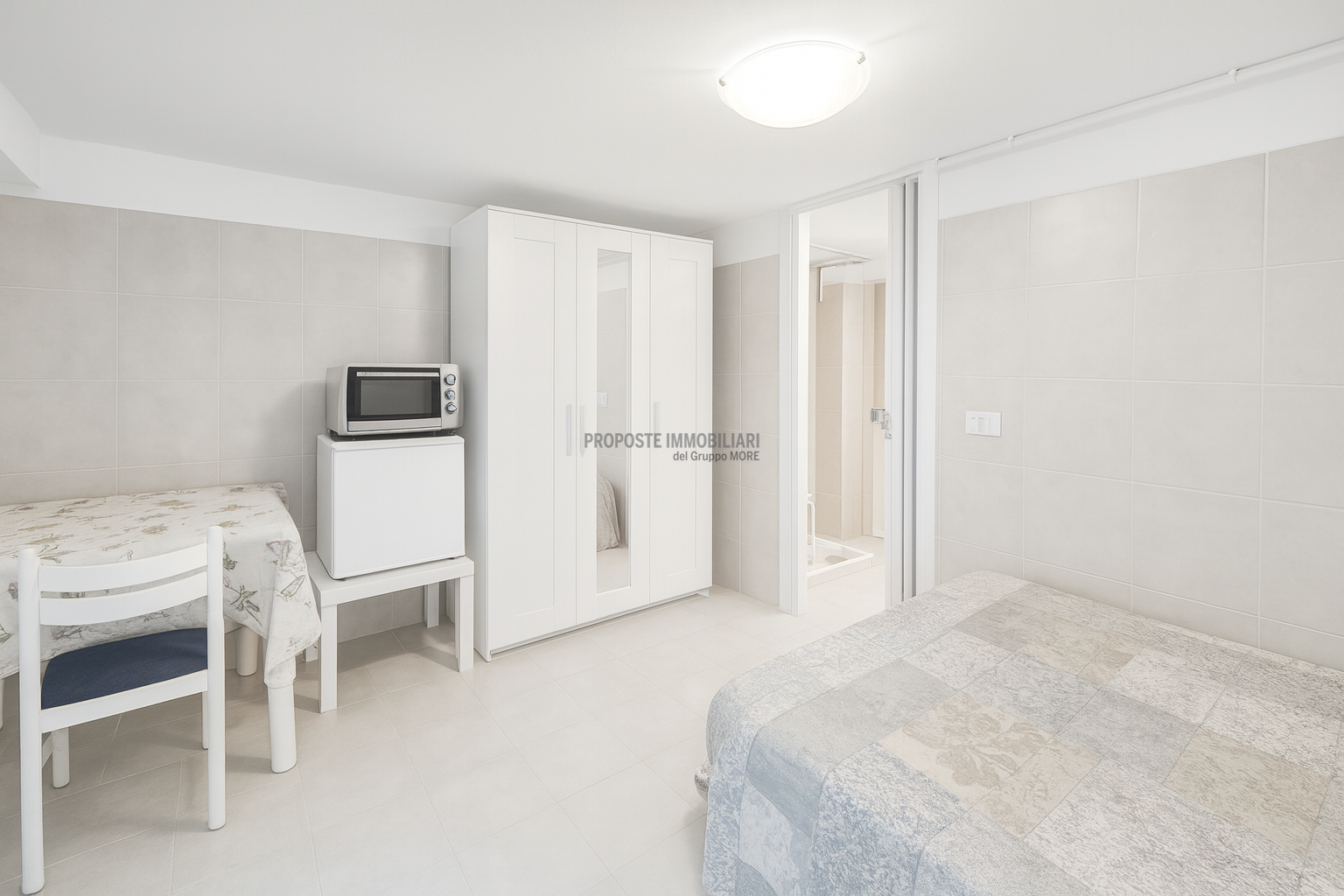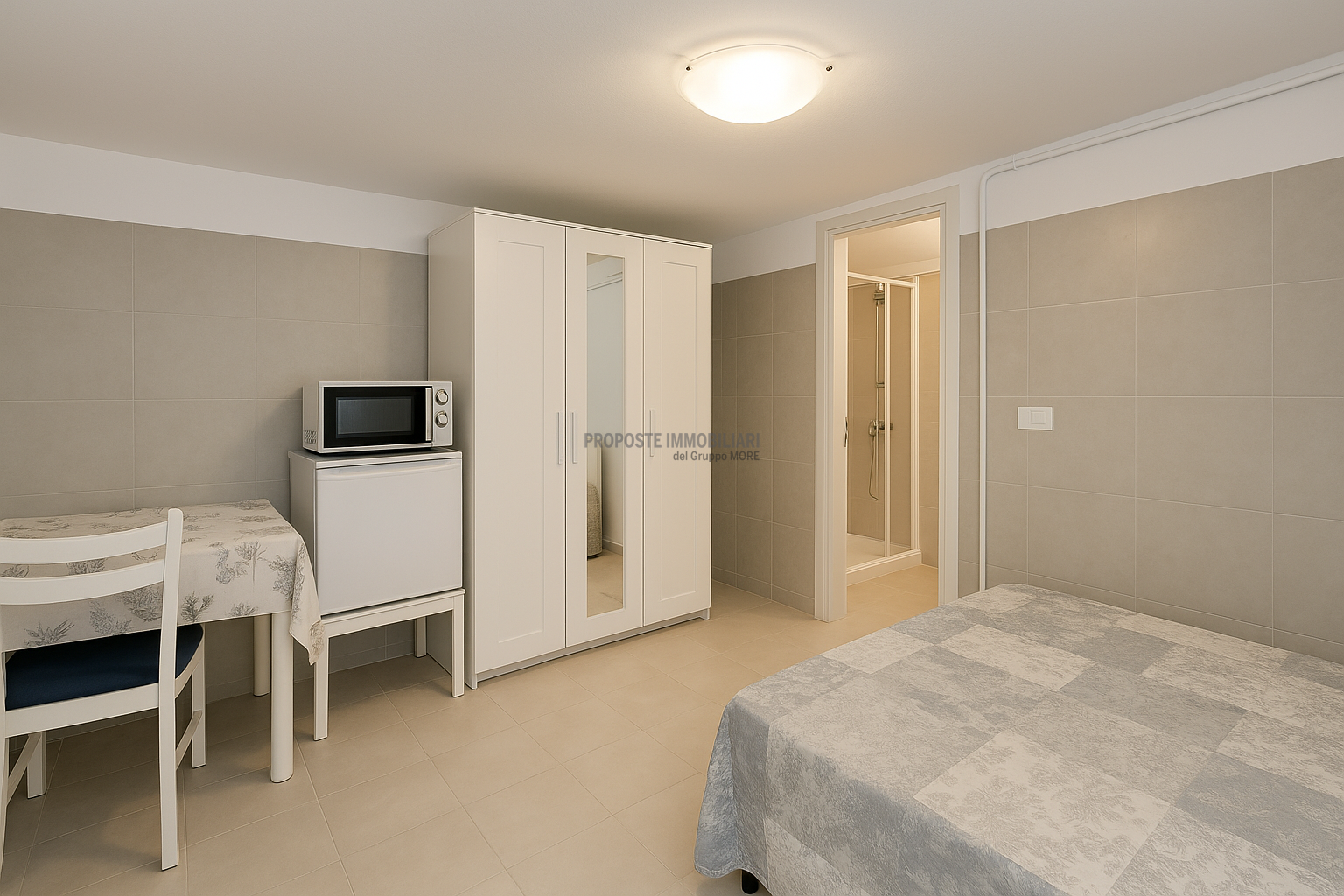 Il monolocale, costruito nel 1980 e in buono stato, è dotato di aria condizionata e riscaldamento a pompa di calore, garantendo comfort in ogni stagione. Situato al piano terra con ascensore, l'appartamento è facilmente accessibile. La cucina è vuota, offrendo la possibilità di personalizzarla secondo i propri gusti.